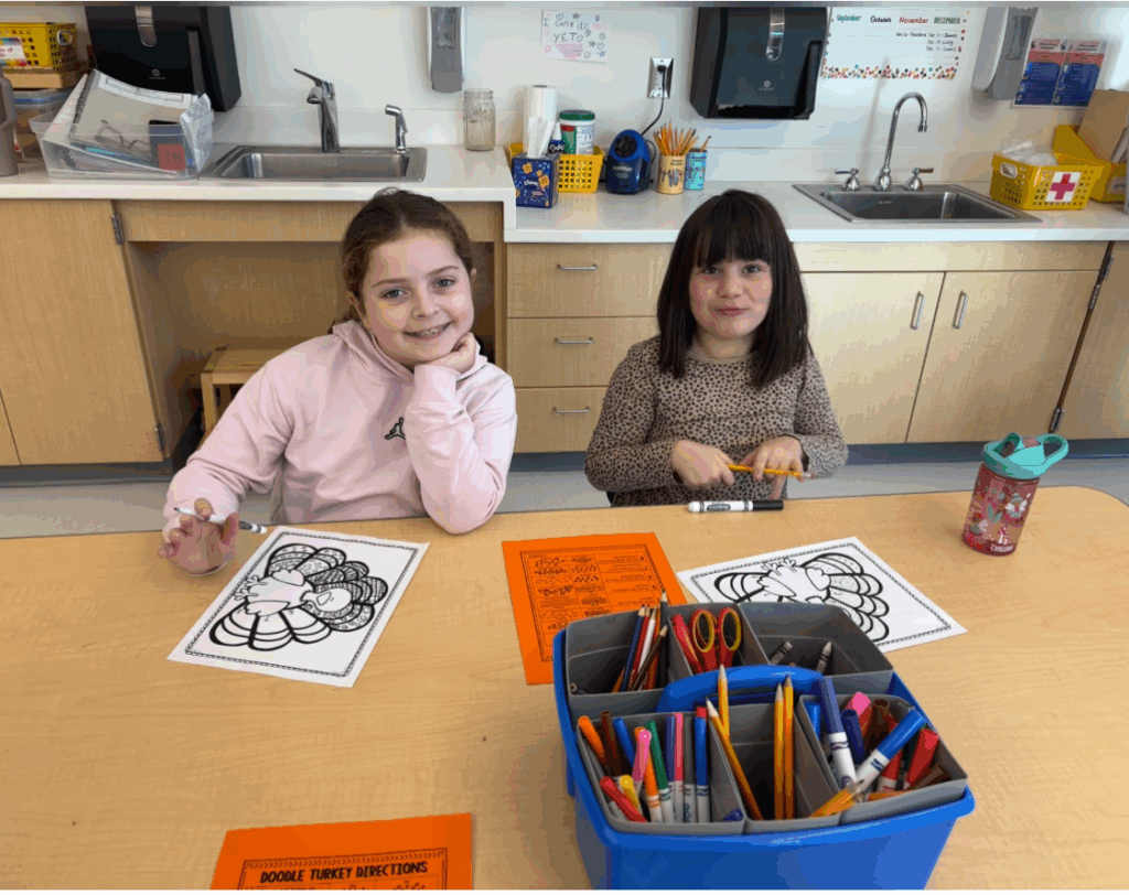 *On Friday, we had Class Buddies. Students met with their buddy classes and many enjoyed Thanksgiving themed activities. A second and fourth grader coloring a turkey.